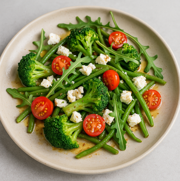 Giet de groenten af en dresseer op een bord met de snoeptomaten, feta en rucola.